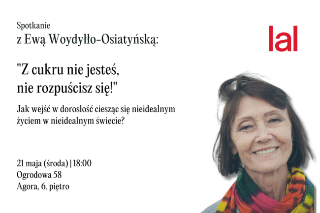 Przenosimy naszą kultową  „współczesność” z sali lekcyjnej do konferencyjnej! W środę 21 maja o godz.18:00 zapraszamy na jej wyjątkową odsłonę, dedykowaną naszej lalowej społeczności, przyjaciołom, a przede wszystkim – nowoprzyjętym uczennicom i uczniom LAL! Gościć będziemy panią Ewę Woydyłło-Osiatyńską, doktorkę psychologii, psychoterapeutkę, autorkę licznych publikacji, członkinię Fundacji Batorego, odznaczoną przez Prezydenta RP Krzyżem Oficerskim Orderu Odrodzenia Polski. Tematem spotkania będzie wkraczanie w dorosłość naszej Młodzieży. Zastanowimy się…